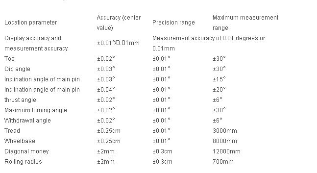 The cabinet adopts the movable case and the column is electrically raised and lowered; the camera adopts the Sony imported camera 5 million pixel lens system, with the processing speed of 30 pictures / second; the reflector shell is made of aerospace aluminum alloy material, with the dynamic vision algorithm technology, the software is easy to operate, and the data can be read quickly; the three-dimensional dynamic display image operation guide is used to guide the operation; the rolling compensation is short and micro distance Trolley, wheelbase difference, wheelbase difference, accurate test data, real-time monitoring of standard plate, 10-23 inch rims can be checked by standard four-point fixture, simple equipment maintenance and maintenance, no need for regular calibration; aluminum alloy corner wheel is convenient for checking parameters such as steering base parameters and front wheel toe angle; standard data base, free of charge, update the database file once a year; the product is recognized by ISO quality system and EU CE safety Card.